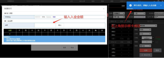 4、看到右上角提示绑卡成功,输入入金金额,点击确认,即 可完成签约绑卡入金。