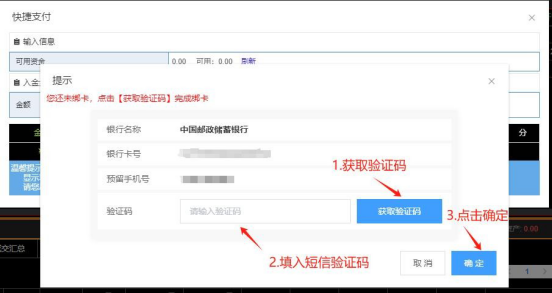 3、未签约绑卡账号,第一次进入会提示获取短信验证码绑卡, 按顺序操作,完成签约绑卡。